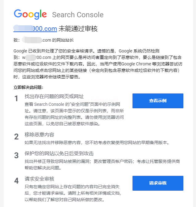 在提交恢復(fù)正常訪問審核之前,一定要先處理好網(wǎng)站安全問題,否則就會收到以下反饋,如下圖所示: