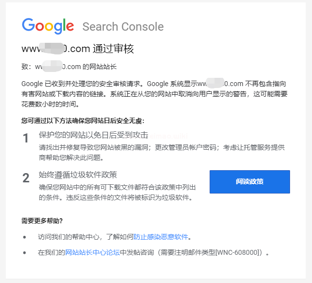 已收到你的安全審核請求,系統(tǒng)檢測到你的網(wǎng)站中不再包含指向有害網(wǎng)站及鏈接內(nèi)容,系統(tǒng)正在取消向用戶的的警告,這可能需要花費(fèi)數(shù)小時(shí)的時(shí)間。
