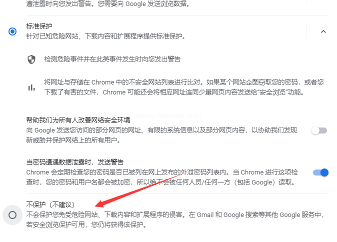 關(guān)閉谷歌瀏覽器“不保護(hù)(不建議)不會保護(hù)您免受危險(xiǎn)網(wǎng)站、下載內(nèi)容和擴(kuò)展程序的侵害”這個功能,但在Gmail和Google搜索等其他Google服務(wù)中,如果安全服務(wù)可用,仍然獲得保護(hù)。