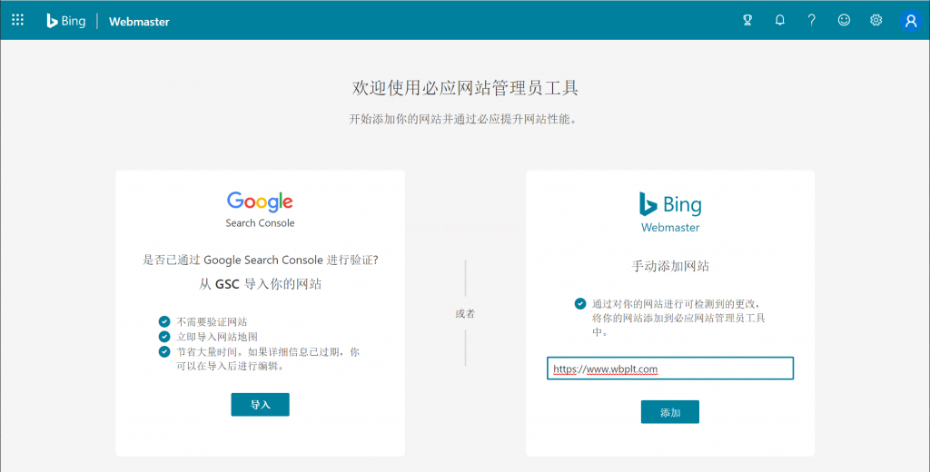 如果你是新用戶,需要先注冊必應搜索Bing站長工具帳號,注冊登錄成功后,就會提示你需要添加網站地址,如果使用谷歌站長工具就可以直接導入數據,是非常方便的,也可以自己手動添加網站地址。