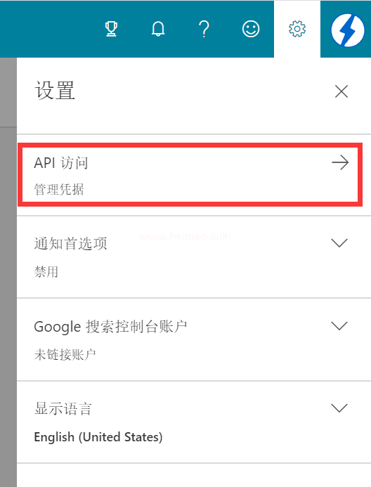 如果你已經登錄了必應搜索站長工具,可以點擊網站左上角網站列表,添加未添加的網站地址,完成網站地址添加后,點擊右上角設置按鈕,選擇API訪問,如下圖所示: