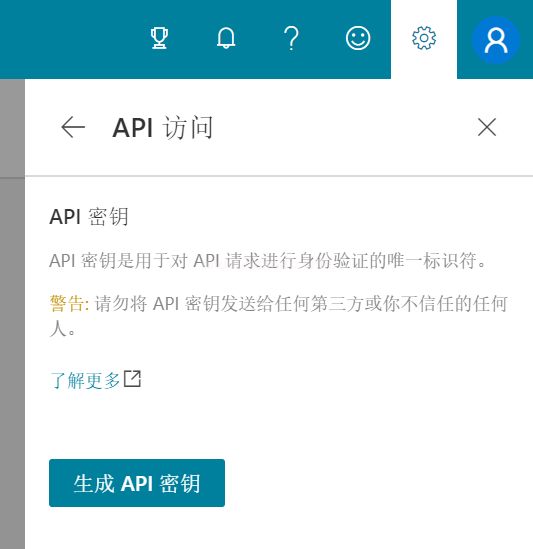 如果你是首次使用必應搜索站長具的API接口,那么還需要點擊生成“API密鑰”,如下圖所示: