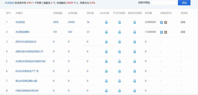 上圖中“水泥制品”是企業行業中的關鍵詞,指數有二千八百多,長尾詞數量有二萬四千多,收錄量也都是非常高的,屬于一個比較難優化的關鍵詞,如果你想優化“水泥制品”“水泥制品模具“這類的關鍵詞,競爭度還是比較大的,“水泥制品”關鍵詞優化難度肯定是高于“水泥制品模具“這個關鍵詞的,一般關鍵詞越短,越熱門,優化難度越高,優化時間周期也會很長,如果優化“水泥制品模具“這類的長尾關鍵詞,競爭度會低一些,流量也會少一點,但優化時間周期會短一點。