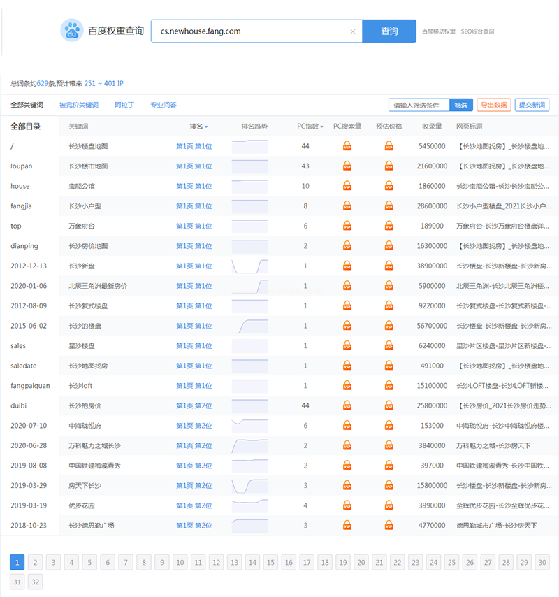 分析上圖中的網站關鍵詞,哪些關鍵詞能夠給網站帶來流量,例如“長沙新盤、長沙房價地圖、長沙的樓盤”這些關鍵詞PC指數為1,這些關鍵詞的流量基本可忽略不計,我們來看看“長沙樓盤地圖”這個關鍵詞PC指數為44,是可以為網站帶來小部分流量的,但這些都是預估值,不一定精準。