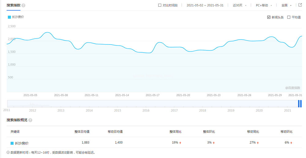 我們還可以通過百度指數來分析“長沙房價”這個關鍵詞,指數有1883,這些數據是百度搜索官方的數據,比第三方站長工具的數據準確率要高一些,如果你選擇優化“長沙房價”這個關鍵詞,要注意這個關鍵詞優化周期肯定會很長,如果你是新站要競爭“長沙房價”這個關鍵詞,沒有半年時間肯定是排不上來。