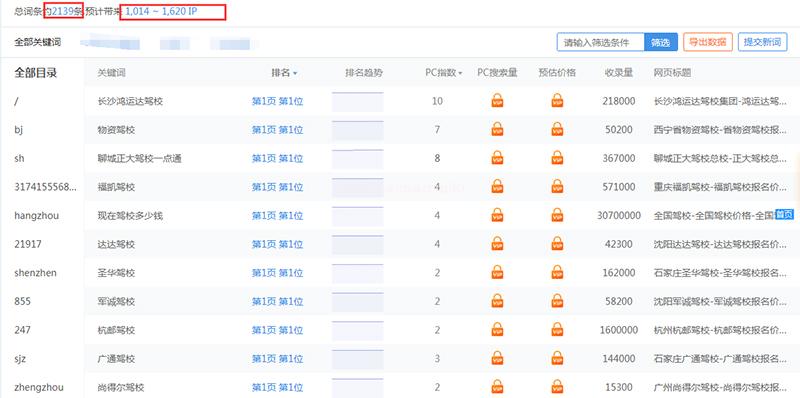 此網站指數100以內的關鍵詞,排名都第一名,如果你也想做一個類似的網站,那么你就可以分析這個網站的關鍵詞,優化的都是一些什么流量關鍵詞,通過以上可以看出優化的主要是一些駕校的名稱,我們就可以從中選擇一些有指數與我們網站定位相樣的駕校關鍵詞,分析下哪些關鍵詞可以為網站帶來流量,我們就可以優先考慮選擇這些關鍵詞進行重點優化,這個就是我們分析同行網站的主要原因。