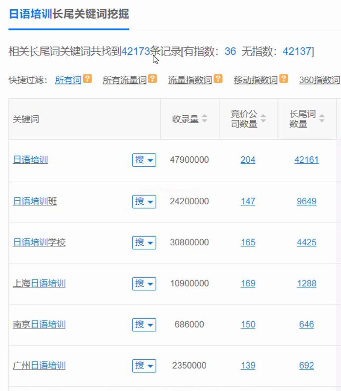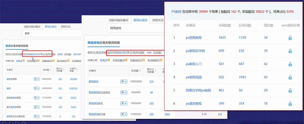 例如上圖中我們挖掘的關(guān)鍵詞“裝修”,有幾十上百萬個(gè)關(guān)于裝修的關(guān)鍵詞,搜索“網(wǎng)絡(luò)游戲”也有二十多萬個(gè)關(guān)鍵詞,搜索“PS教程”有三萬多個(gè)關(guān)鍵詞,有的是有指數(shù)有流量的關(guān)鍵詞,有的是無指數(shù)低流量的關(guān)鍵詞,有指數(shù)的關(guān)鍵詞流量會(huì)高一點(diǎn),無指數(shù)的關(guān)鍵詞我們也需要優(yōu)化,主要是看可以獲得多少這樣的關(guān)鍵詞,網(wǎng)站關(guān)鍵詞數(shù)量越多,網(wǎng)站流量就越多,只要我們將這些關(guān)鍵詞全部進(jìn)行優(yōu)化,網(wǎng)站流量就可以提高上來,因此網(wǎng)站關(guān)鍵詞的詞庫主要還是要靠站長(zhǎng)自己去挖掘,多利用工具平臺(tái)去拓展更多與網(wǎng)站定位相關(guān)的關(guān)鍵詞,無論是有指數(shù)還是無指數(shù)關(guān)鍵詞,都可以收集,再后期進(jìn)行分析與篩選,找出與我們網(wǎng)站定位匹配的關(guān)鍵詞,只要這個(gè)關(guān)鍵詞有流量有用戶搜索需求,都可以收集到我們網(wǎng)站關(guān)鍵詞的詞庫中。