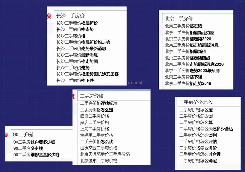 通過上圖中“長(zhǎng)沙二手房?jī)r(jià)格走勢(shì)、北京二手房?jī)r(jià)、二手房?jī)r(jià)格、二手房?jī)r(jià)格怎么定、90二手房多少錢”這些關(guān)鍵詞我們可以將這些關(guān)鍵詞進(jìn)行分類,根據(jù)不同的地區(qū)進(jìn)行劃分,我們就可以導(dǎo)出海量的關(guān)鍵詞,無論是價(jià)格、走勢(shì),還是價(jià)格怎么定之類的關(guān)鍵詞,通過拓詞功能基本上就可以找出這個(gè)行業(yè)所有的關(guān)鍵詞供我們網(wǎng)站使用。