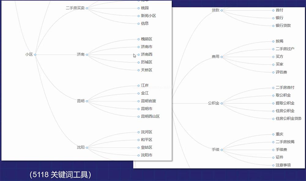 通過“二手房”這個(gè)關(guān)鍵詞進(jìn)行挖詞,首先通過小區(qū)進(jìn)行挖詞,分為不同的小區(qū)和地區(qū),例如濟(jì)南、昆明、沈陽,不同地區(qū)還分某某區(qū)和某某市關(guān)鍵詞,二手房買賣分為桃園、新苑小區(qū),每一個(gè)分支還可以進(jìn)行再細(xì)分,我們只要確定了主關(guān)鍵詞,我們就可以延伸出二級(jí)三級(jí)四級(jí)五級(jí)關(guān)鍵詞,甚至某個(gè)關(guān)鍵詞中再分出地區(qū)關(guān)鍵詞和一些不同的產(chǎn)品關(guān)鍵詞,包括一些品牌關(guān)鍵詞,我們都可以進(jìn)行無限的延伸,就是我們先把主關(guān)鍵詞展開,再對(duì)子關(guān)鍵詞進(jìn)行深度延伸,就可以得到一個(gè)巨大的關(guān)鍵詞庫。