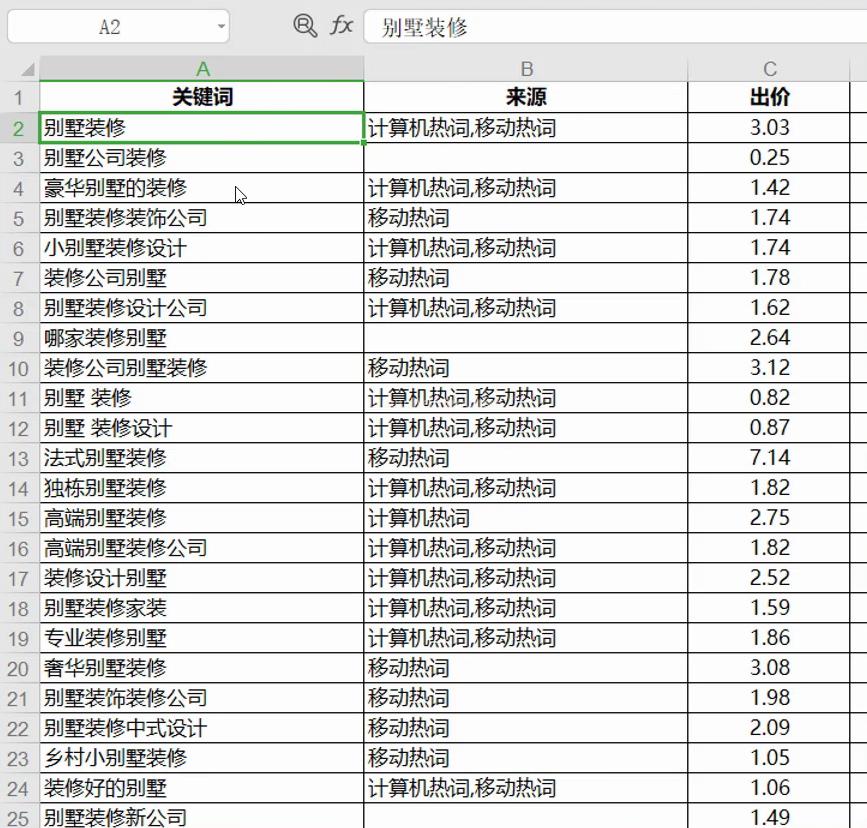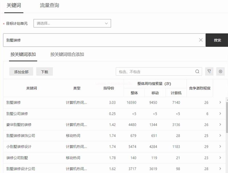 點(diǎn)擊百度推廣助手“關(guān)鍵詞規(guī)則師”工具,輸入別墅裝修,就可以輕松獲取上千個(gè)有關(guān)別墅裝修的關(guān)鍵詞,并且還會(huì)詳細(xì)顯示該關(guān)鍵詞當(dāng)前的熱度、類別、價(jià)格、競(jìng)爭(zhēng)度,我們利用這個(gè)工具就可以獲得我們想要在關(guān)鍵詞,短時(shí)間內(nèi)就可以獲得上千個(gè)關(guān)鍵詞,大家可以試試?yán)眠@個(gè)工具挖掘你需要的關(guān)鍵詞。
