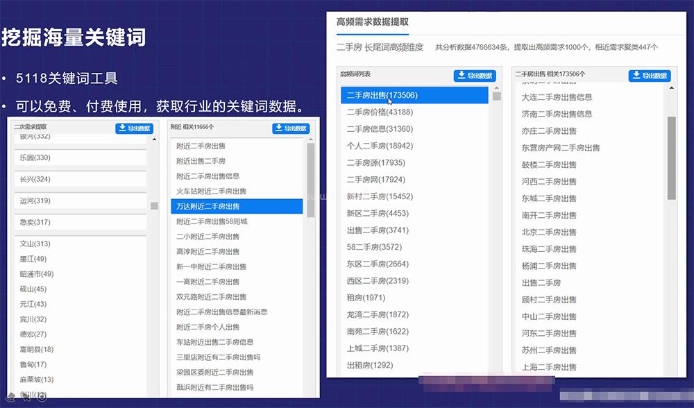 5188關(guān)鍵詞挖掘工具也是可以免費(fèi)使用的,但也提供了付費(fèi)功能,通過這個(gè)工具我們也可以輕松獲得各個(gè)行業(yè)的批量關(guān)鍵詞,比如說“二手房”相關(guān)的關(guān)鍵詞,通過搜索“二手房”就會(huì)出現(xiàn)“二手房出售、二手房?jī)r(jià)格、二手房信息”等相關(guān)的關(guān)鍵詞,每個(gè)關(guān)鍵詞我們還可以進(jìn)行細(xì)分,例如我們點(diǎn)擊“二手房出售”這個(gè)關(guān)鍵詞,可將其分成不同地區(qū)的二手房出售相關(guān)信息,例如“大連二手房出售信息、濟(jì)南二手房出售信息”等,所以說這個(gè)關(guān)鍵詞的詞庫量是超級(jí)巨大的,每個(gè)挖掘出來的關(guān)鍵詞,還可以拓展出不同的二級(jí)詞、三級(jí)詞,四級(jí)詞,甚至更深一級(jí)的關(guān)鍵詞,有興趣的朋友們可以試試。