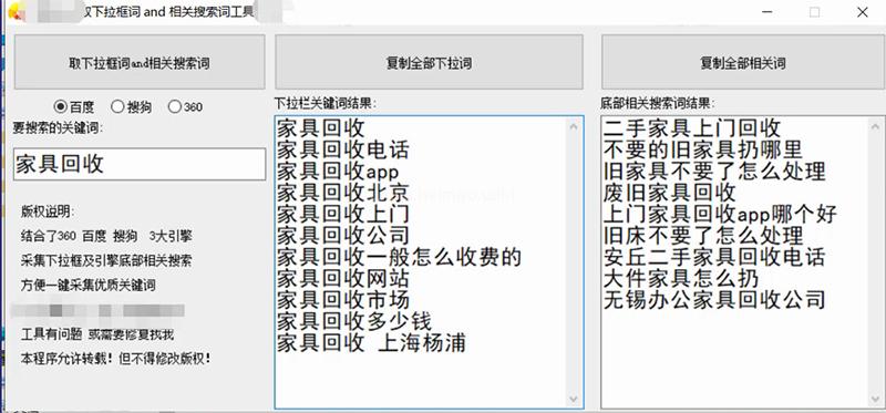 下圖中也是一個(gè)關(guān)鍵詞挖掘工具,例如搜索“家具回收”,點(diǎn)擊“取下拉框詞and相關(guān)搜索詞”就可以一下子將百度下拉關(guān)鍵詞找出來,還可以找出底部的相關(guān)搜索關(guān)鍵詞,有了這樣的工具可大大提高我們的工作效率。