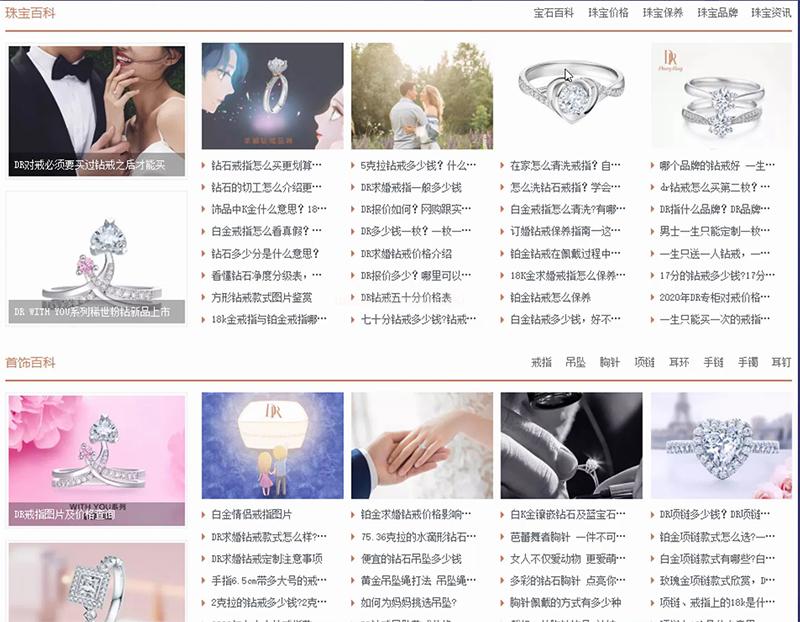 上圖為行業(yè)資訊新聞?wù)荆兄A康馁Y訊內(nèi)容,例如珠寶類的百科,百科又分為價(jià)格、保養(yǎng)、品牌、資訊,首飾類的百科,又可以分為吊墜、鉆戒,我們?cè)龠M(jìn)行細(xì)分,就可以獲得海量的內(nèi)容,將這些內(nèi)容我們就可以做成一個(gè)新聞資訊站,比如問答、資訊等,這些都是我們可以使用的,而且基本所有行業(yè)都可以使用這種方案,實(shí)現(xiàn)網(wǎng)站內(nèi)容的更新和海量詞庫的優(yōu)化,當(dāng)網(wǎng)站有了流量以后,進(jìn)流量導(dǎo)入到產(chǎn)品購買頁面,這種流量用戶一般都是很精準(zhǔn)的,很容易就轉(zhuǎn)化了。