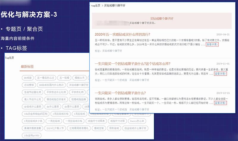 上圖中某個(gè)電商網(wǎng)站的專題頁,例如“買鉆戒哪個(gè)牌子好”,下面內(nèi)容都是關(guān)于鉆戒哪個(gè)牌子好的相關(guān)內(nèi)容,這樣的頁面就是專題頁面,只要與鉆戒哪個(gè)牌子好相關(guān)的內(nèi)容全部匯總在這個(gè)頁面,tag標(biāo)簽頁面,也有大量關(guān)于鉆戒哪個(gè)牌子好的相關(guān)標(biāo)簽,每一個(gè)tag標(biāo)簽都是一個(gè)關(guān)鍵詞,點(diǎn)擊進(jìn)去都是關(guān)于鉆戒的內(nèi)容,將同個(gè)關(guān)鍵詞的內(nèi)容進(jìn)行聚合,形成一個(gè)新的網(wǎng)站頁面,這種頁面就稱之為專題頁或聚合頁。