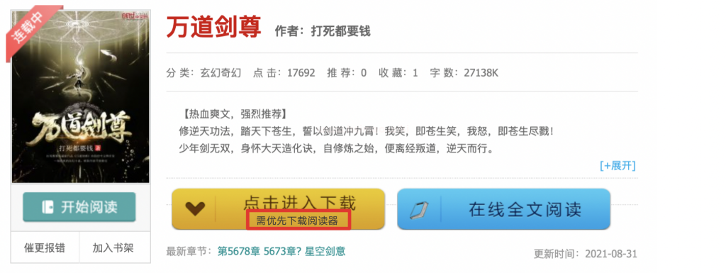 頁面在下載前提示用戶需優先下載小說閱讀器