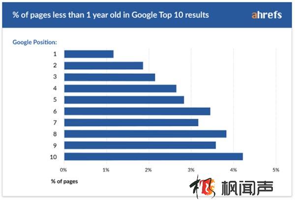 可以看到,排到第一的頁面中只有1%多一點是1年以下的新頁面,排到第10的也只有4%是1年的新頁面。