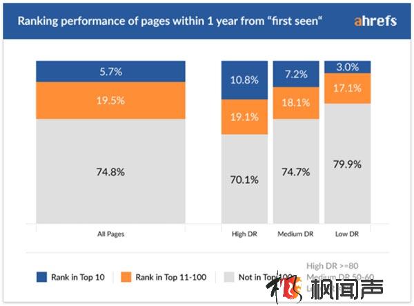 可以看到,這些1年歷史的頁面,只有5.7%獲得了至少一個關鍵詞的前10排名。域名外鏈越強,這個比例就越高,新頁面獲得排名的越多。74.8%的1年新頁面基本上沒有排名。
