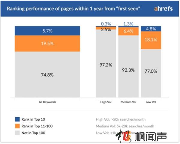 越熱門、查詢量越高的關鍵詞,新頁面獲得排名的比例越低。查詢量每月5萬次以上的熱門詞,只有0.3%的1年新頁面獲得了第一頁排名。