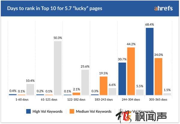 可以看到,在這5.7%獲得前10排名的頁面中,中等競爭程度的詞需要6個月以上,熱門詞需要8個月以上。同樣要注意的是,這是那5.7%獲得第一頁排名的少量頁面花的時間,絕大部分1年新頁面根本沒有排名。